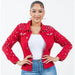 - Stay fabulous in this eye-catching jean jacket adorned with radiant pearls and rhinestone decorations in a bold red color.