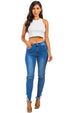 Details- High waist font button, skinny style cut-off ankle look, spandex