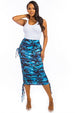 Details-Pencil style max skirt, dual ruched drawstring side look, elasticized waist